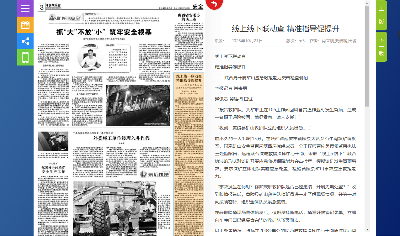 此外,陕西局已成立线上监察综合协调组,针对各矿山企业和专兼职救护队常态化开展线上线下联动专项检查,完善“督查—移交—整改—回头看”闭环监督机制,指导督促矿山企业和救护队解决共性、突出问题,推动全省矿山不断提升应急救援能力。