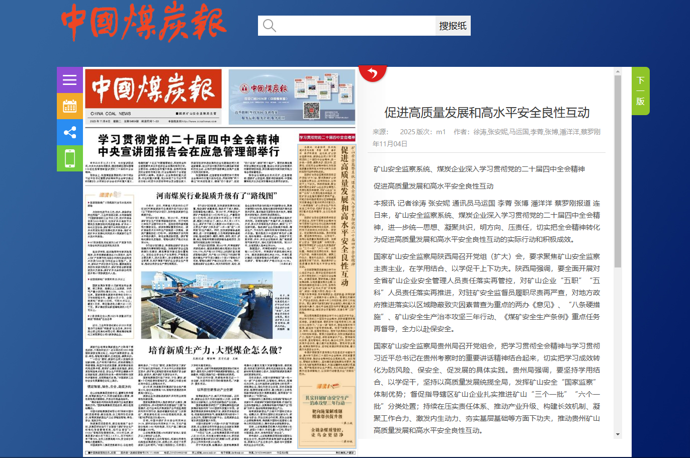 本报讯 记者徐涛报道 连日来,矿山安全监察系统、煤炭企业深入学习贯彻党的二十届四中全会精神,进一步统一思想、凝聚共识,明方向、压责任,切实把全会精神转化为促进高质量发展和高水平安全良性互动的实际行动和积极成效。