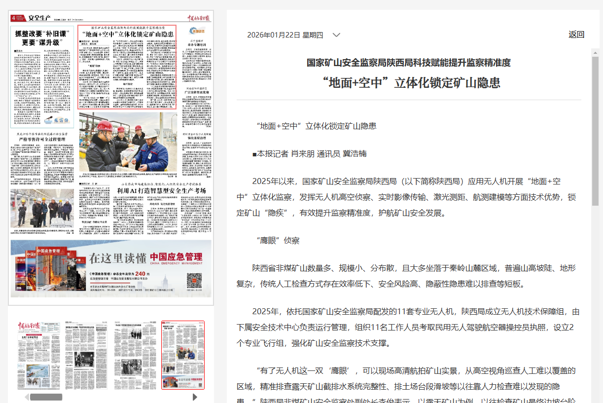 本报记者 肖来朋 通讯员 冀浩楠 2025年以来,国家矿山安全监察局陕西局(以下简称陕西局)应用无人机开展“地面+空中”立体化监察,发挥无人机高空侦察、实时影像传输、激光测距、航测建模等方面技术优势,锁定矿山“隐疾”,有效提升监察精准度,护航矿山安全发展。